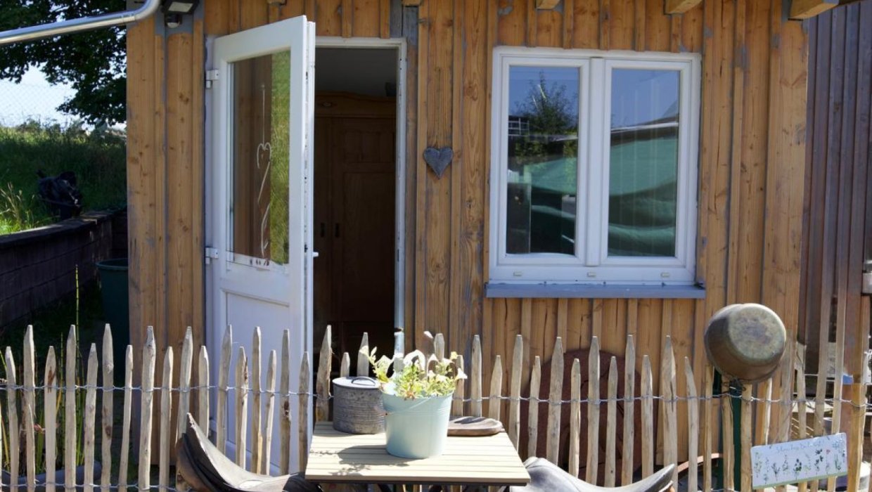 Holzhütte mit Naturdeko und rustikalem Mobiliar